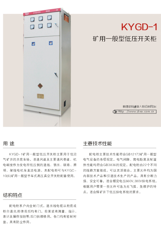 KYGD-1礦用一般型低壓開關柜主要用于低沼氣礦井的井底車場,總進風道及主要進風巷道、機電峒室作為變電所低壓側的進線、饋出、聯絡、照明、架線電機車直流電源。本配電柜可與KYGC-10(6)礦用-般型手車式高壓真空開關柜配套使用。